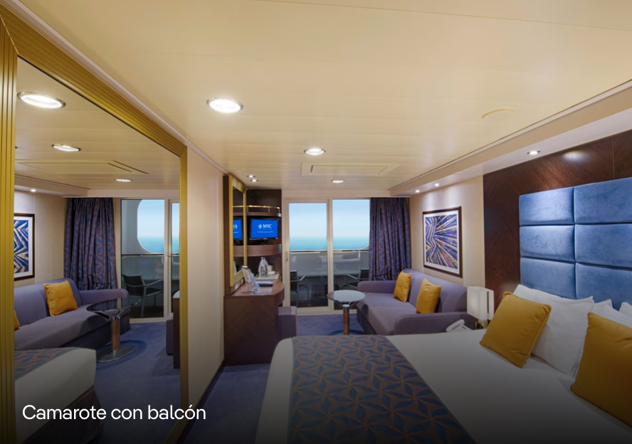 Los camarotes con balcón colaboración con De Jorio Design International para llevar la clase del buque MSC Fantasia a una dimensión completamente nueva. Inspirado en la mismísima Sophia Loren, el barco MSC Divina te ofrece toda la elegancia y glamour de la edad de oro de los viajes por mar, con una nueva visión. Una espaciosa y ultramoderna interpretación que te deleitará con un suntuoso confort y una amplia variedad de instalaciones deportivas y de ocio, además de actividades de entretenimiento de primera categoría.