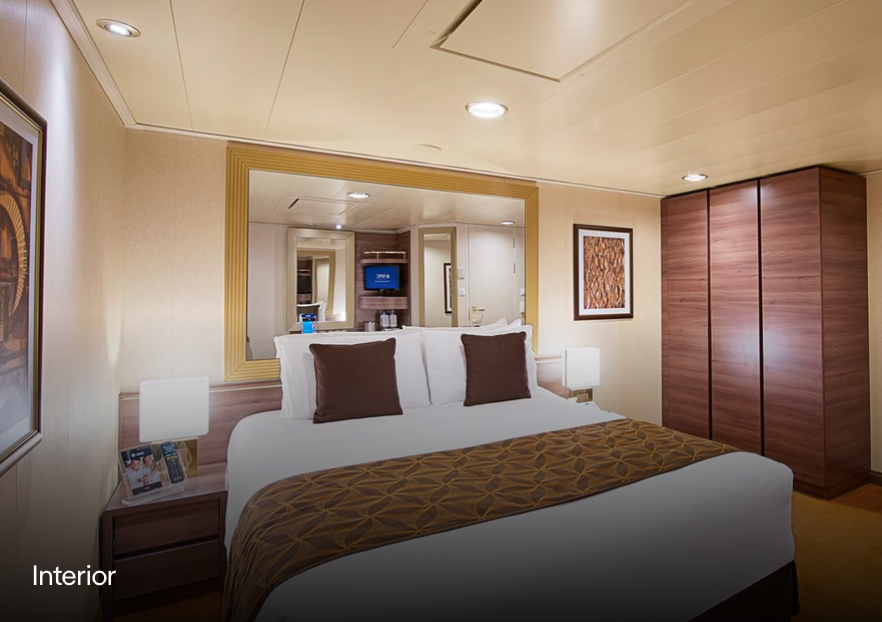 Camarotes elegantemente equipados con cama de matrimonio convertible en dos camas individuales, aire acondicionado, amplio armario, cuarto de baño privado con ducha o bañera, TV interactiva, teléfono, conexión a internet vía Wi-Fi, minibar y caja fuerte. Consumos no incluidos.