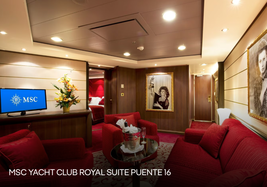 Descubre el exclusivo "barco dentro de un barco" que es MSC Yacht Club con su servicio de mayordomo las 24 horas. La Suite Real de Sophia Loren en la cubierta 16 fue diseñada con la ayuda de la propia Sra. Loren e incluso incluye una réplica de su tocador.