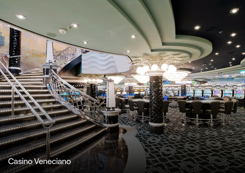 La inagotable dedicación de MSC Cruceros a sus pasajeros es más evidente en los inmejorables programas de entretenimiento e instalaciones a bordo de MSC Divina, con su increíble teatro “The Strand Theatre”, la futurista Discoteca y el Casino Veneciano con más de 1000 metros cuadrados de casino y la sala de videojuegos Virtual World.