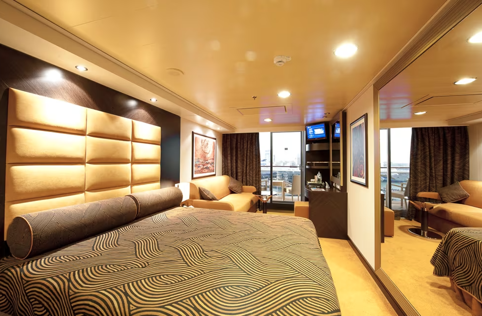 Camarotes elegantemente equipados con cama de matrimonio convertible en dos camas individuales, aire acondicionado, amplio armario, cuarto de baño privado con ducha o bañera, TV interactiva, teléfono, conexión a internet vía Wi-Fi, minibar y caja fuerte. Consumos no incluidos.